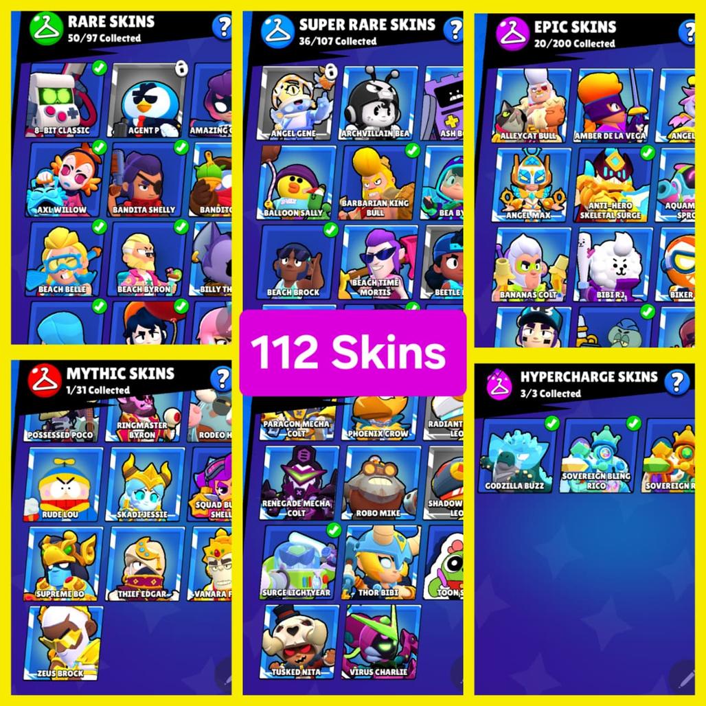 🎭 Total Skins: 112 (🟢 50 Rare, 🔵 36 Super Rare, 🟣 20 Epic, 🔴 1 Mythic, 👑 2 Legendary , ⚡3 HYPER)