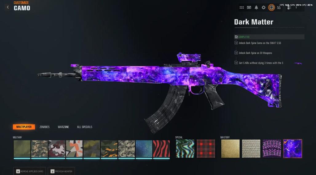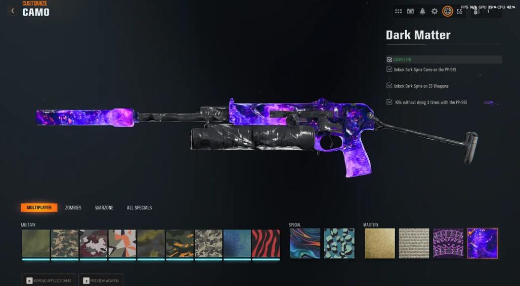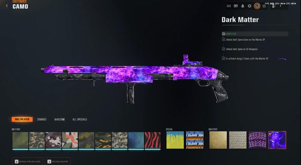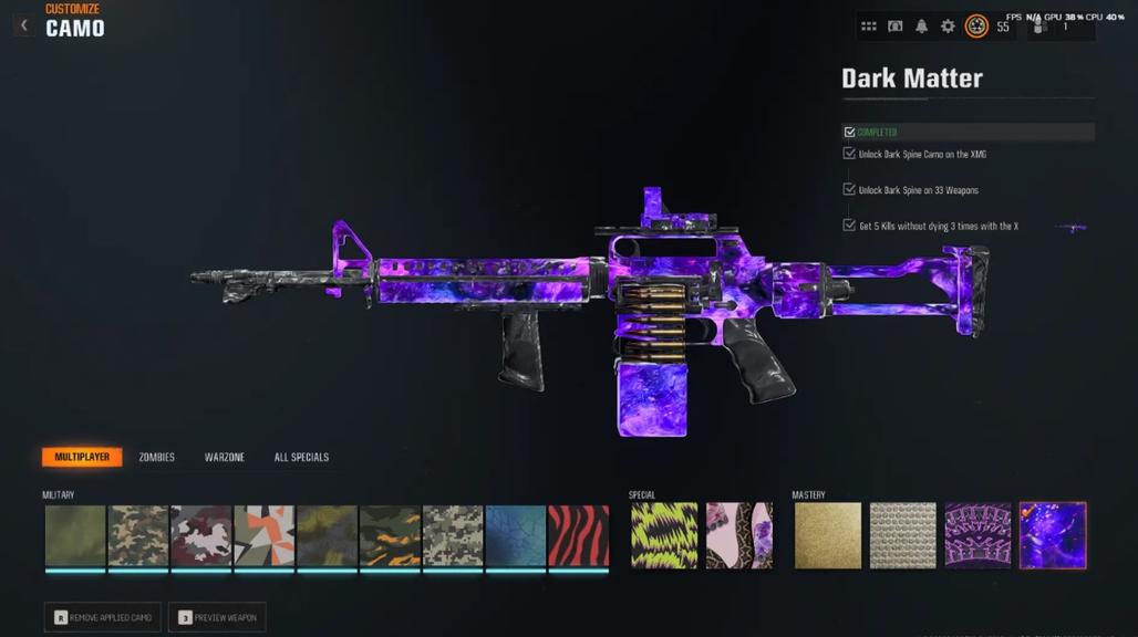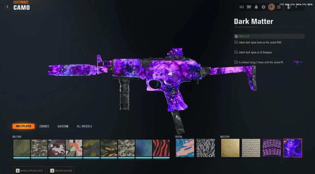 3333 Dark Matter Camo Prestige Master including PARK 50 Wins 495 Camos All MP Camos Unlocked
