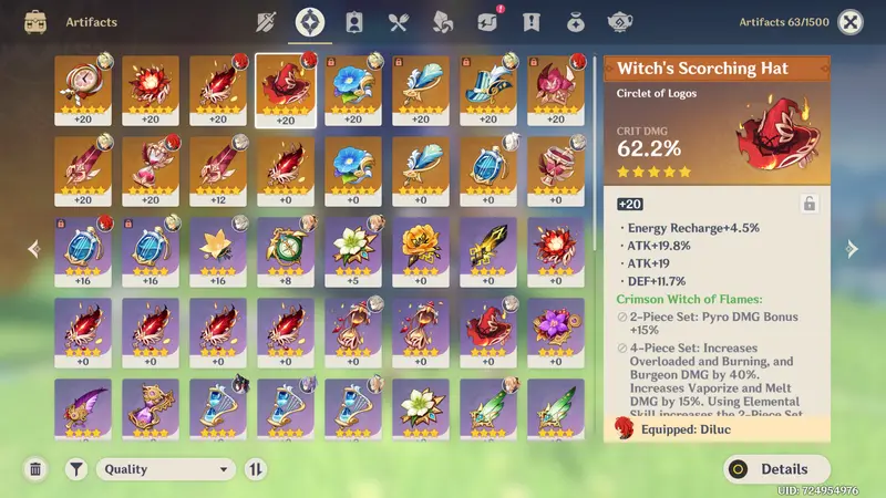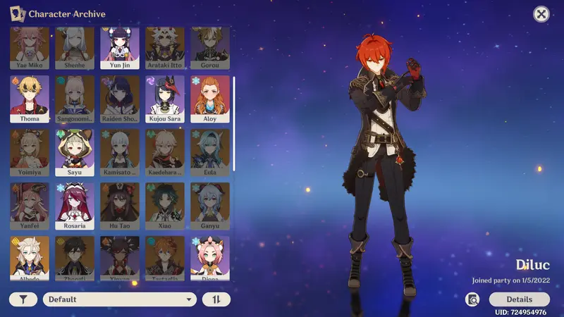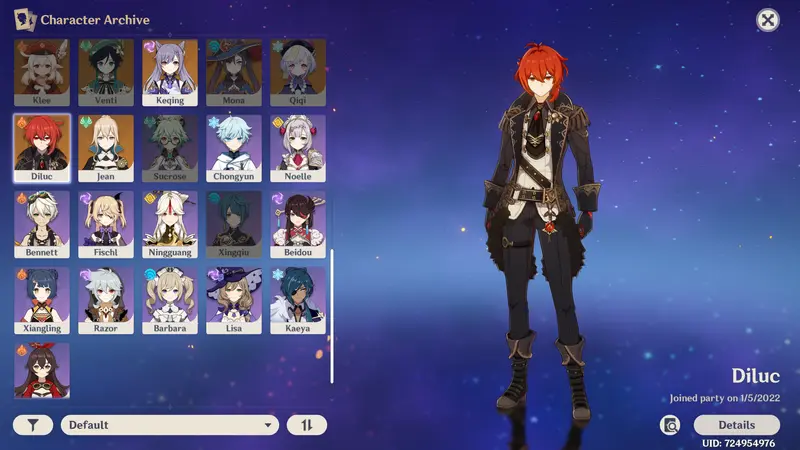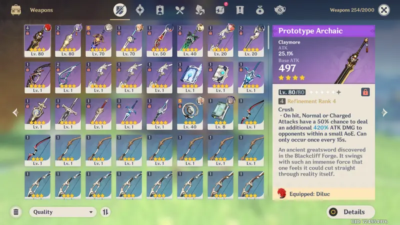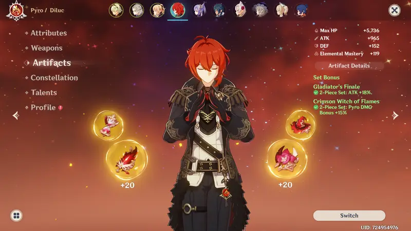 Diluc c0 lvl. 80 with r4 Prototype Archaic lvl. 80 and half build Crimson Witch n half Gladiators (four maxed 5*)
