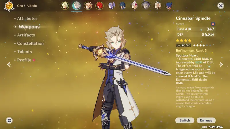 Albedo c0 lvl. 80 with r5 Cinnabar Spindle lvl. 70