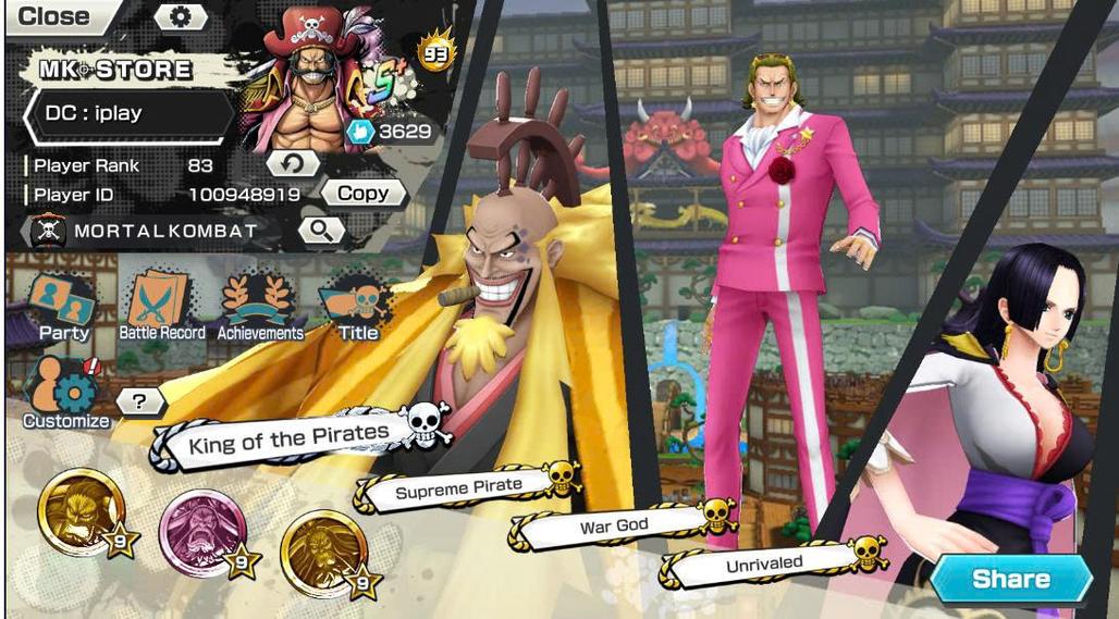 BR609-IOS+Android-Hyber Boost 93+Roger v1 Skin Full Boost+7 Ex Max(+Luffy Gear 5 +Kuzan+Snake+Kid Law+Yamato+Black Beard)+Vip Medal+Support 169%+Many Bounty Festival Max+Strong Account+Kng Alber+Uta Hallowen