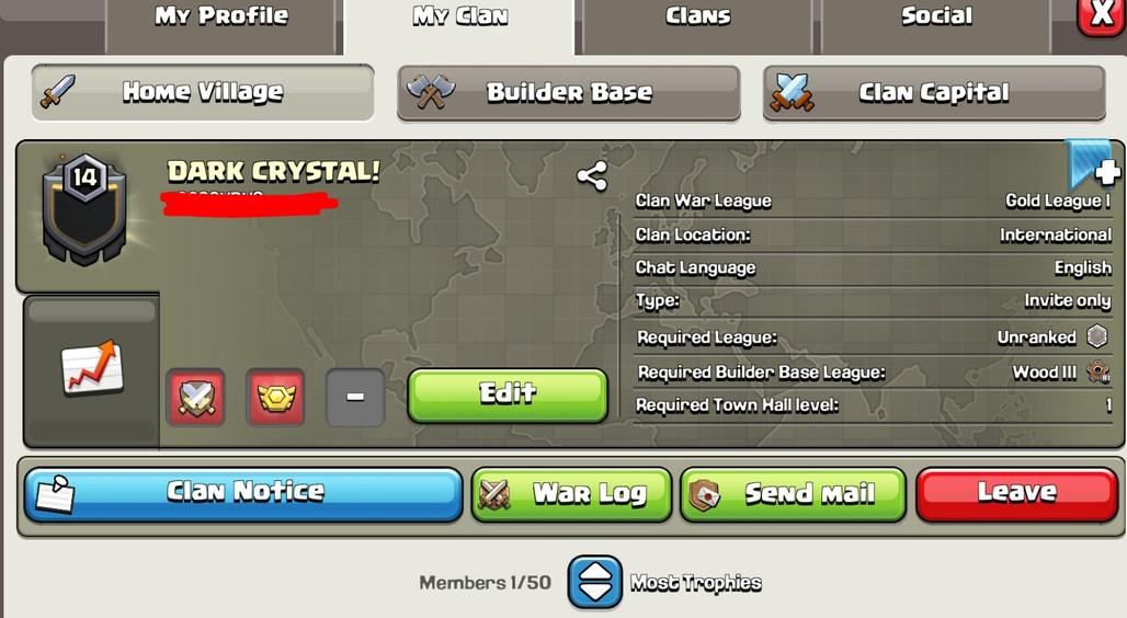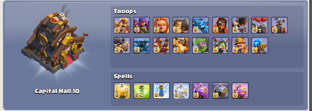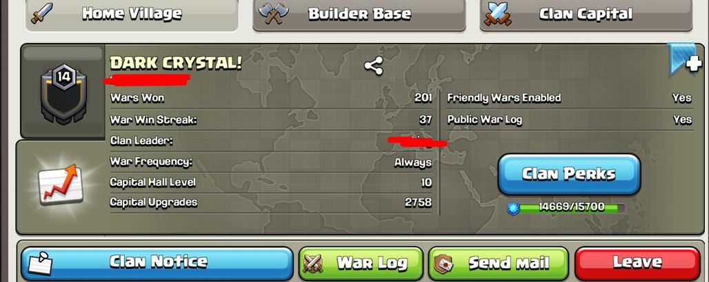 CAPITAL HALL 10 ( 2758 upgardes) | Clan Level 14.9 | Name : DARK CRYSTAL! | Wins 201 Losses 171 | Gold 1