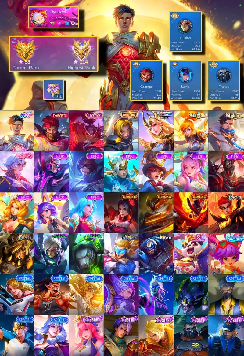 CEL LVL 39 | 212 SKINS | 58 HEROES | EPIC RECALL AND ELIMINATION | GUSION 11.11 - GRANGER EXORCIST - HAYABUSA LUCKYBOX