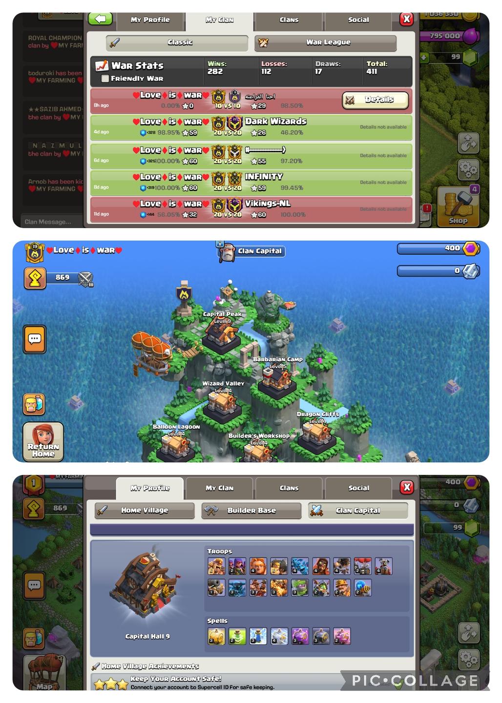 [] Clan Level--19 []💥Name--LOVE IS WAR💥[] Capital Hall-9 [] Positive War Log--Win-282 [] Lose only 112 []