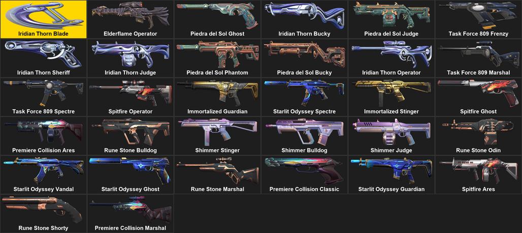Elderflame Operator, Iridian Thorn Blade, Piedra del Sol Ghost, Iridian Thorn Bucky, Piedra del Sol Judge, Task Force 809 Frenzy, Iridian Thorn Sheriff, Iridian Thorn Judge, Piedra del Sol Phantom, Piedra del Sol Bucky, Iridian Thorn Operator, Task Force 809 Marshal, Task Force 809 Spectre, Spitfire Operator, Immortalized Guardian, Starlit Odyssey Spectre, Immortalized Stinger, Spitfire Ghost, Premiere Collision Ares, Rune Stone Bulldog, Shimmer Stinger, Shimmer Bulldog, Shimmer Judge, Rune Stone Odin, Starlit Odyssey Vandal, Starlit Odyssey Ghost, Rune Stone Marshal, Premiere Collision Classic, Starlit Odyssey Guardian, Spitfire Ares, Rune Stone Shorty, Premiere Collision Marshal