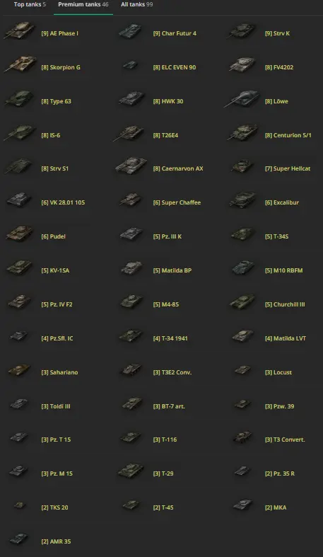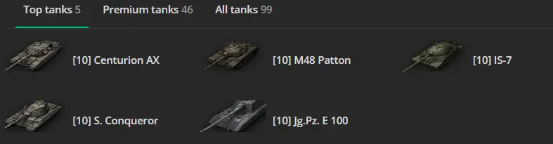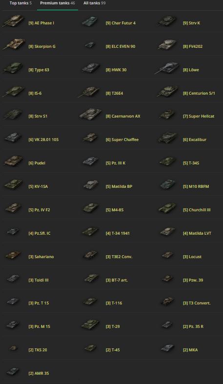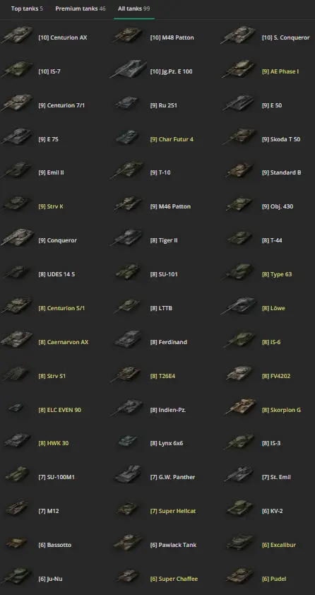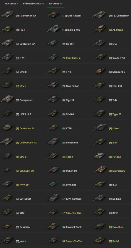 [EU] 5 TIER X | 46 PREMIUM TANK | TOTAL TANKS 99 | 3950 (49) WINS | 825,988 CREDITS | GOLD 6838 | SEE DESCRIPTION