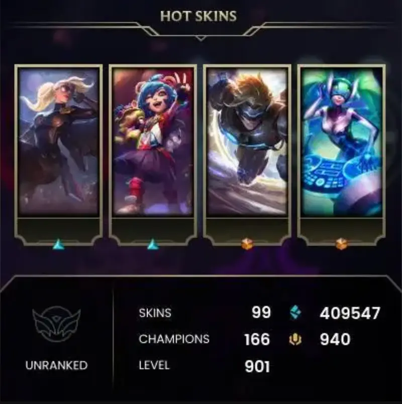 đ After purchase, you get a League of Legends account with 901 level. Rank - Unranked. ĐĄhampions 166. Blue essence 409547. Riot points 940. Quantity of Rare Skins - 6 + Valorant account 23 lvl. The data is given from the account Riot Games + data from the mail, which is tied to it. You will be able to link your mail. You are allowed to change the account data and its settings.