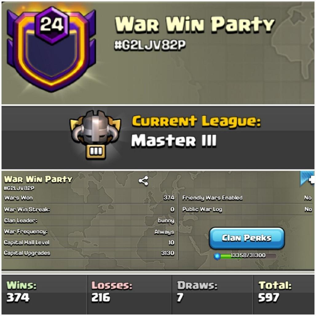 Level 24 clan || clan capital 10 || master 3 || warlog 374-216 || name - War Win Party