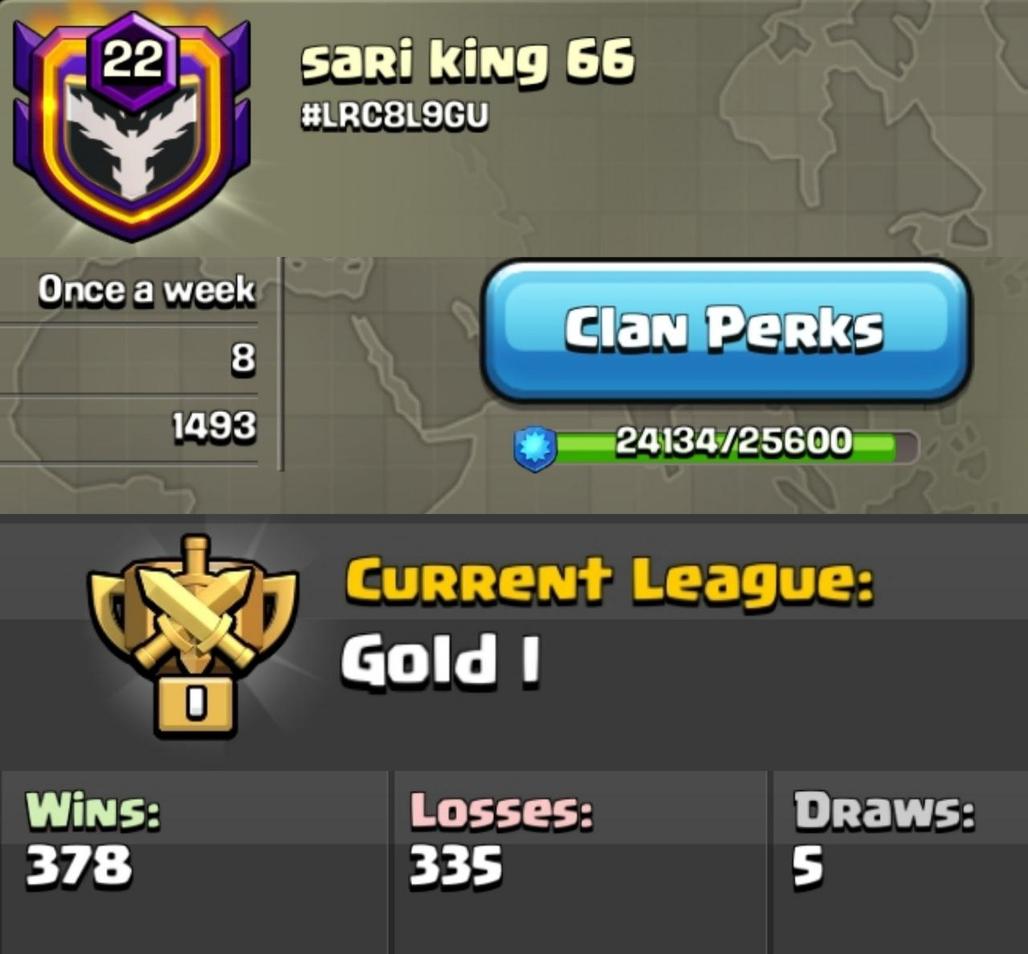 VERY CHEAP 💎NEAR 23 💎 NAME: sari king 66 - LEVEL: 22 - CAPITAL HALL: 8 - WAR LOG: 378-335 -CWL LEAGUE: GOLD I